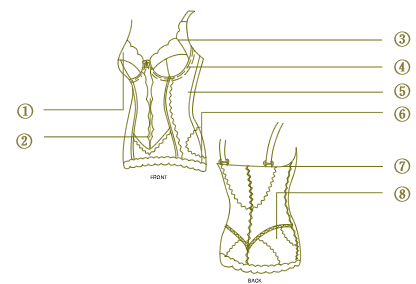 1 カップは丸みと高さを出す為、3枚接ぎの立体裁断にして厚みのあるしっかりしたカップ芯を使用してバストをすっきり整えます。